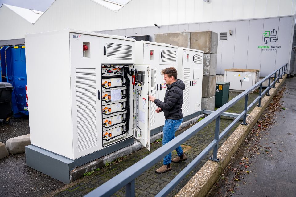 Bij Groen-Direkt hebben we drie RCT Power CESS200 systemen geplaatst, goed voor in totaal 300 kW aan batterijvermogen en 699 kWh opslagcapaciteit. De batterijen zijn gekoppeld aan een PV-installatie van 700 kWp en worden aangestuurd door een slim EMS-systeem dat de opwek en het verbruik op elkaar afstemt. Dit systeem handelt actief op verschillende energiemarkten en voorkomt terugleververliezen door het tijdelijk afregelen (curtailen) van zonneproductie op piekmomenten.